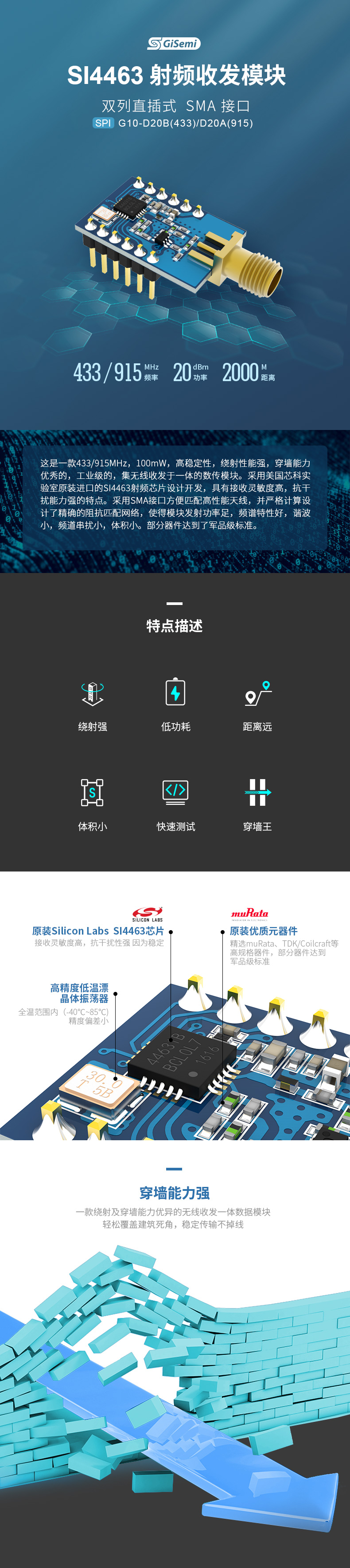 這是一款433/915MHz,100mW,高穩(wěn)定性,繞射性能強,穿墻能力優(yōu)秀的,工業(yè)級的,集無線收發(fā)于一體的數(shù)傳模塊。采用美國芯科實驗室原裝進口的SI4463射頻芯片設計開發(fā),具有接收靈敏度高,抗干擾能力強的特點。采用SMA接口方便匹配高性能天線,并嚴格計算設計了精確的阻抗匹配網(wǎng)絡,使得模塊發(fā)射功率足,頻譜特性好,諧波小,頻道串擾小,體積小。部分器件達到了軍品級標準。