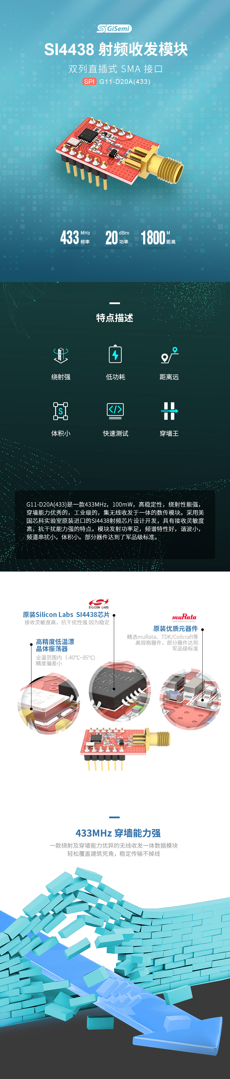 G11-D20A(433)是一款433MHz,100mW,高穩(wěn)定性,繞射性能強(qiáng),穿墻能力優(yōu)秀的,工業(yè)級(jí)的,集無(wú)線收發(fā)于一體的數(shù)傳模塊。采用美國(guó)芯科實(shí)驗(yàn)室原裝進(jìn)口的SI4438射頻芯片設(shè)計(jì)開(kāi)發(fā),具有接收靈敏度高,抗干擾能力強(qiáng)的特點(diǎn)。模塊發(fā)射功率足,頻譜特性好,諧波小,頻道串?dāng)_小,體積小。部分器件達(dá)到了軍品級(jí)標(biāo)準(zhǔn)。