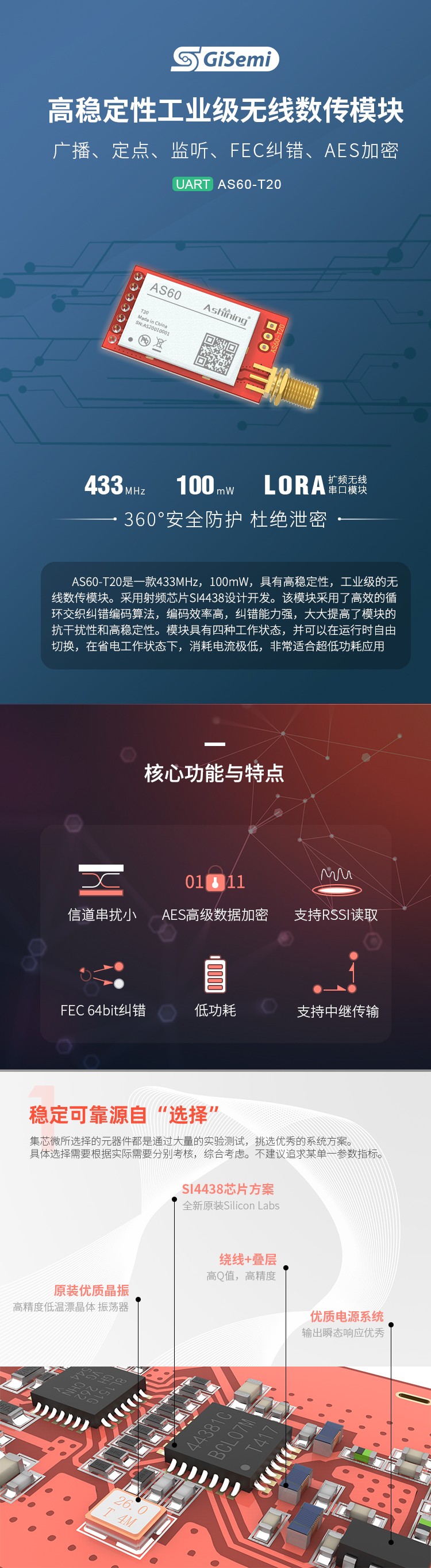 433MHz , 100mW,無線串口模塊,廣播、定點、監(jiān)聽、FEC糾錯、AES加密