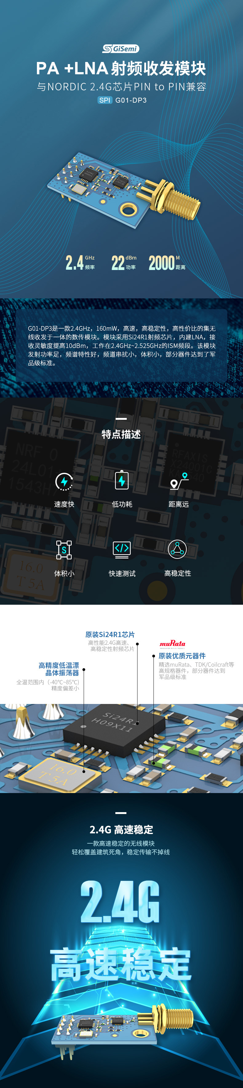 G01-DP3 是一款 2.4GHz,160mW,高速,高穩(wěn)定性,高性價比的集無線收發(fā)于一體的數(shù)傳模塊。模塊采用杭州中科微原裝 Si24R1 射頻芯片與 AT2401 功放芯片,內(nèi)建 LNA,接收靈敏度提高 12dB,工作在 2.4GHz~2.525GHz 的 ISM 頻段。該模塊發(fā)射功率足,頻道串?dāng)_小,體積小,諧波抑制好,部分器件達到了軍品級標(biāo)準(zhǔn)。