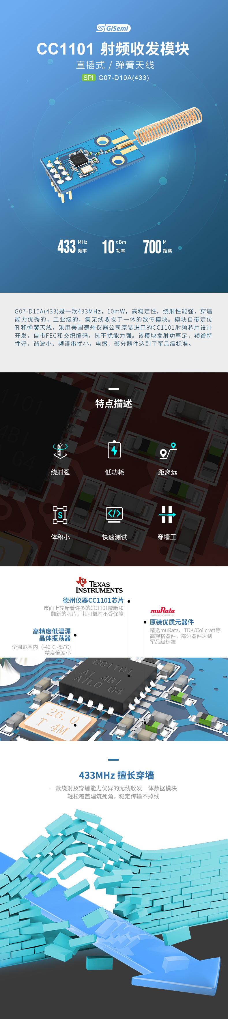 G07-D10A(433)是一款433MHz,10mW,高穩(wěn)定性,繞射性能強(qiáng),穿墻能力優(yōu)秀的,工業(yè)級的,集無線收發(fā)于一體的數(shù)傳模塊。模塊自帶定位孔和彈簧天線,采用美國德州儀器公司原裝進(jìn)口的CC1101射頻芯片設(shè)計(jì)開發(fā),自帶FEC和交織編碼,抗干擾能力強(qiáng)。該模塊發(fā)射功率足,頻譜特性好,諧波小,頻道串?dāng)_小,電感,部分器件達(dá)到了軍品級標(biāo)準(zhǔn)。