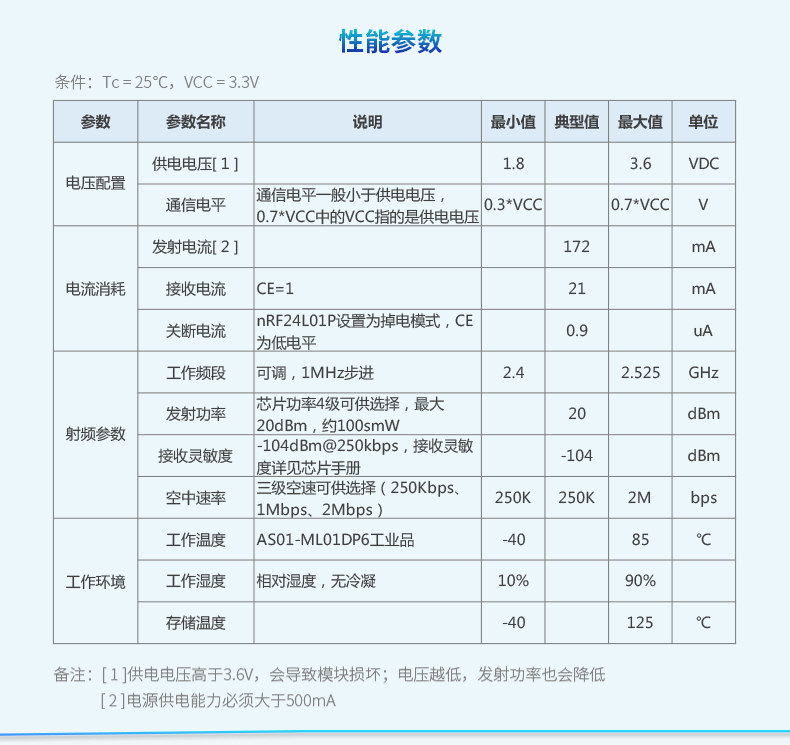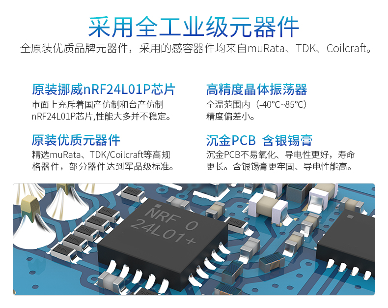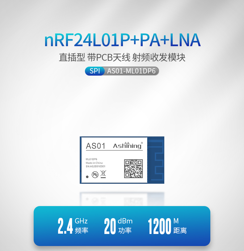 AS01-ML01DP6是一款2.4GHz,100mW,高速,高穩(wěn)定性,工業(yè)級的,集無線收發(fā)于一體的數(shù)傳模塊。模塊自帶高性能PCB天線,精確阻抗匹配,帶有金屬屏蔽罩,抗干擾性能強。采用NORDIC原裝nRF24L01P射頻芯片與RFX2401C功放芯片,內(nèi)建LNA,接收靈敏度提高10dBm,工作在2.4GHz~2.525GHz的ISM頻段。該模塊發(fā)射功率足,頻譜特性非常好,諧波非常小,頻道串?dāng)_小,體積小,部分器件達到了軍品級標(biāo)準(zhǔn)。