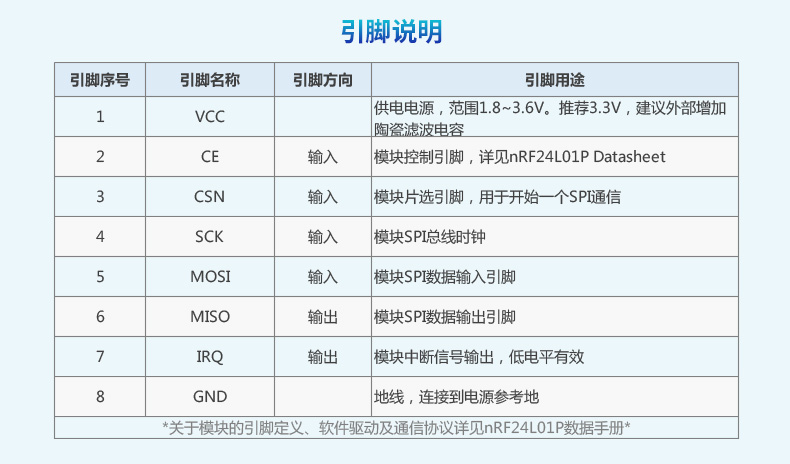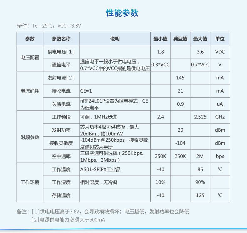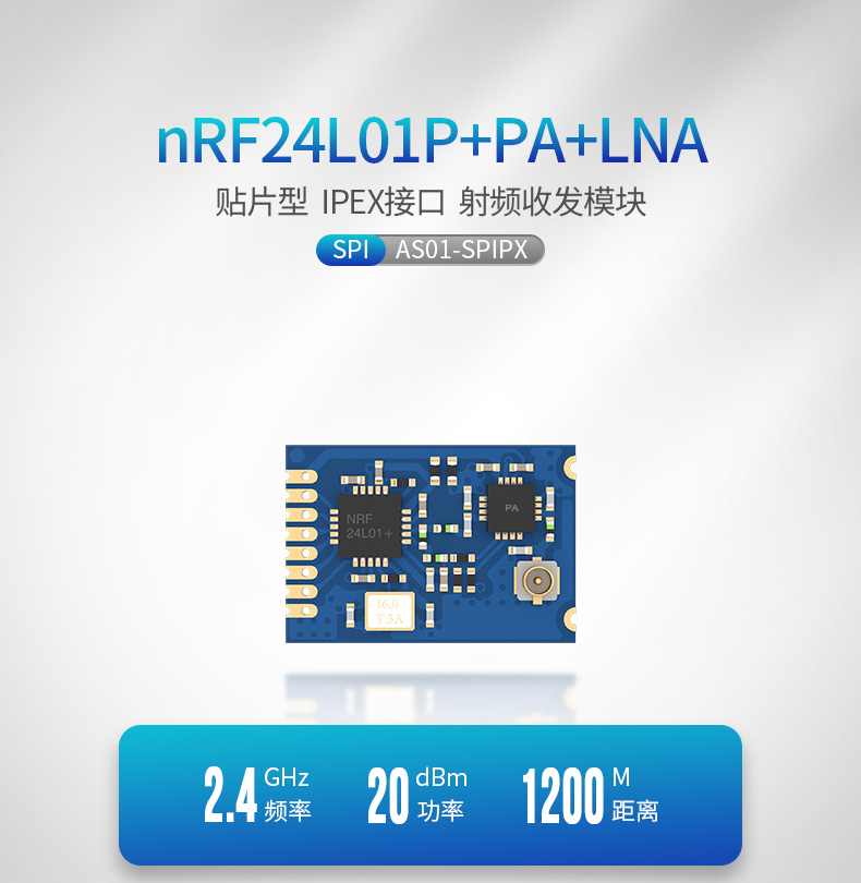 AS01-SPIPX是一款2.4GHz,100mW,高速,高穩(wěn)定性,工業(yè)級的集無線收發(fā)于一體的數傳模塊。模塊采用NORDIC原裝nRF24L01P射頻芯片與RFX2401C功放芯片,內建LNA,接收靈敏度提高10dBm,工作在2.4GHz~2.525GHz的ISM頻段。該模塊輸出接口為IPEX,超小體積,方便內嵌在產品里邊。模塊足20dBm發(fā)射功率,頻譜特性非常的好,諧波極小,信道間串擾極小,部分器件達到了軍品級標準。