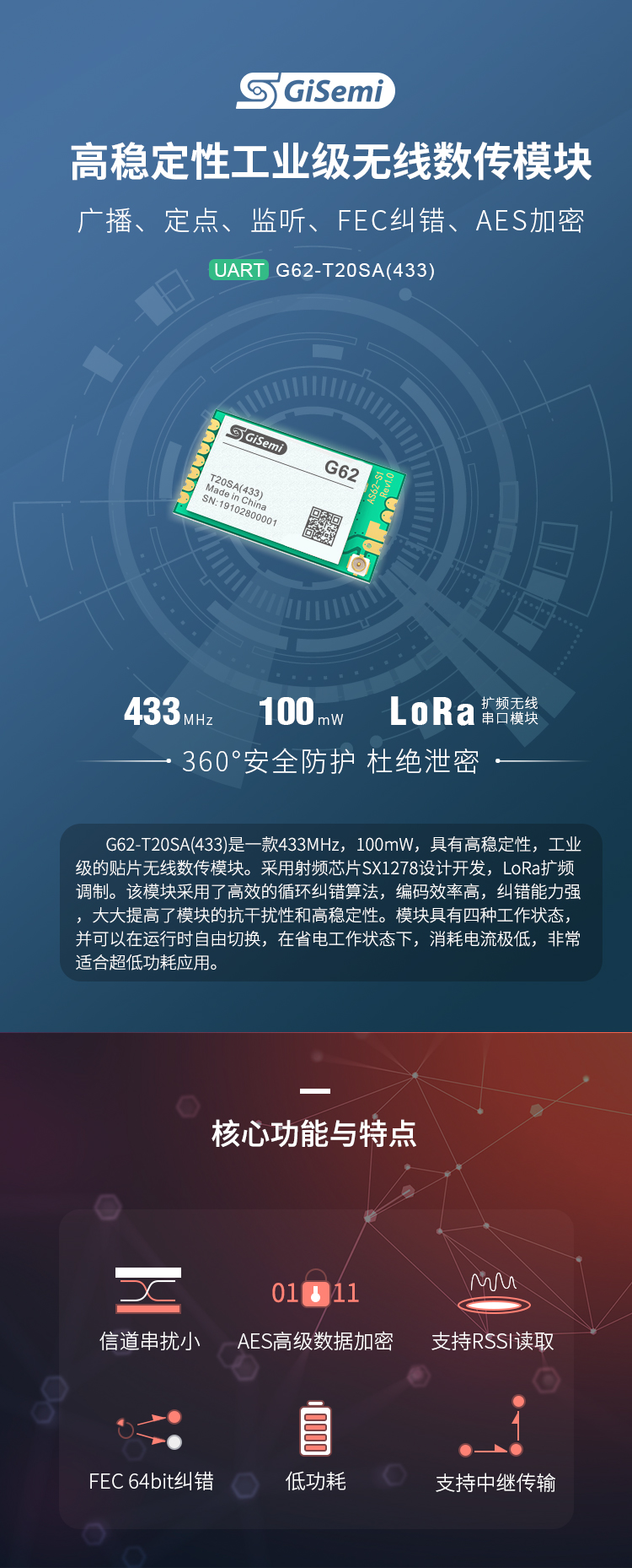 433MHz , 100mW,LORA擴(kuò)頻無(wú)線串口模塊,廣播、定點(diǎn)、監(jiān)聽(tīng)、FEC糾錯(cuò)、AES加密